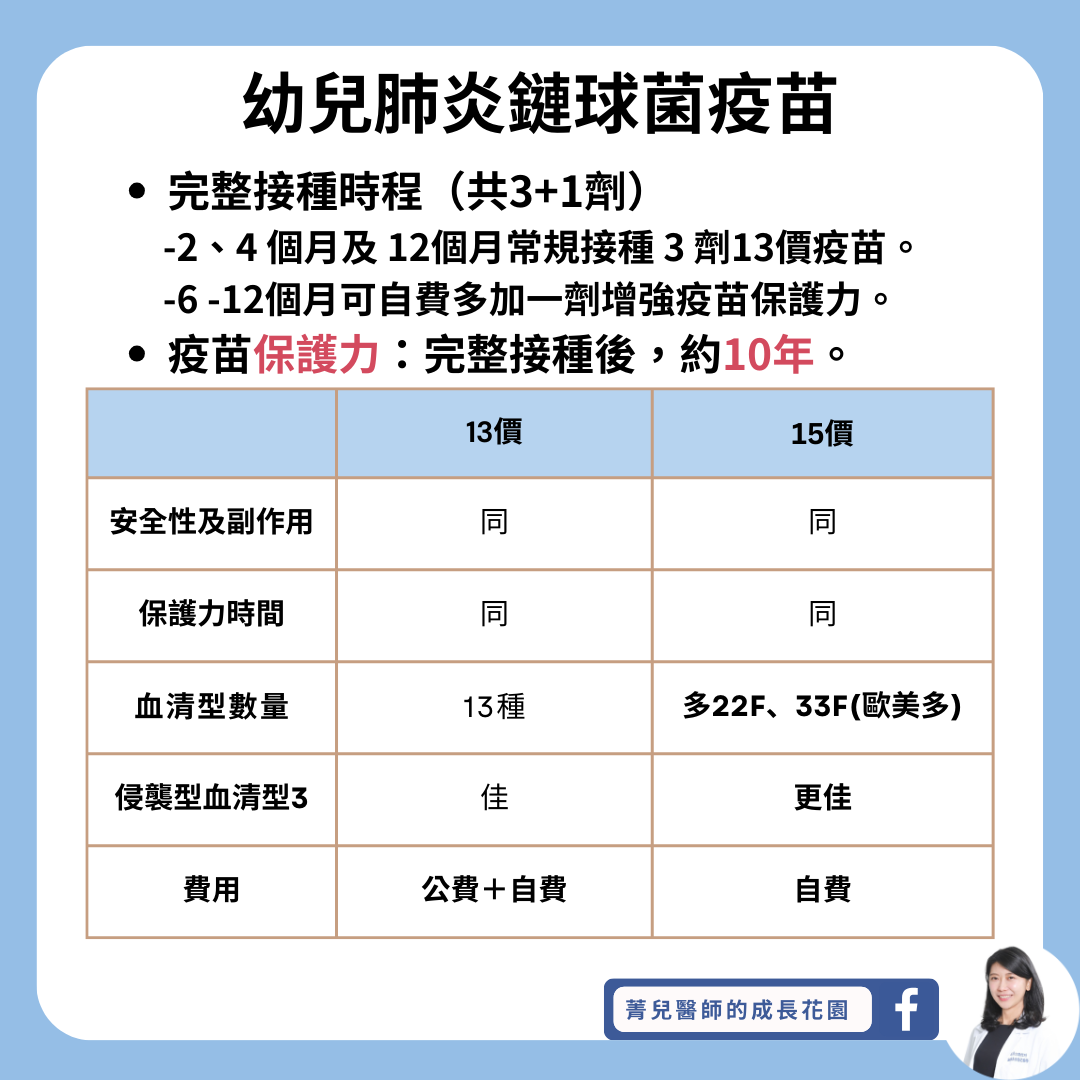 - 15價疫苗的 安全性,疫苗副作用(如:發燒)及保護時效 與13價疫苗 差不多 。