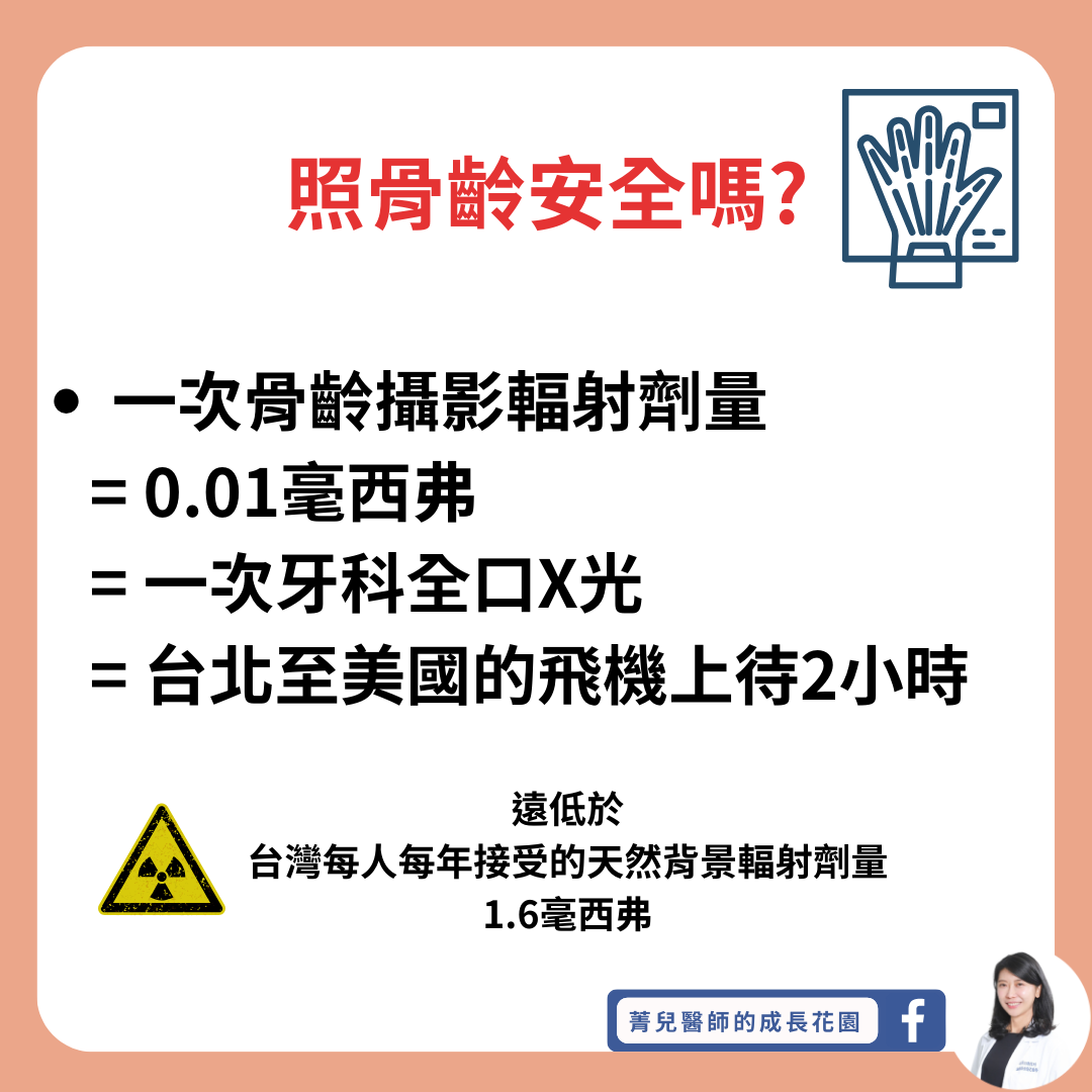 骨齡是照左手的X光,拍攝手腕這樣的小範圍部位的X光片檢查,輻射劑量極低。