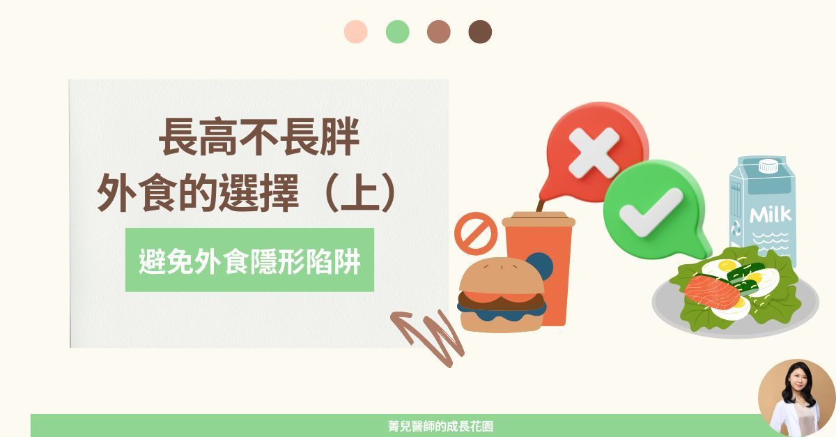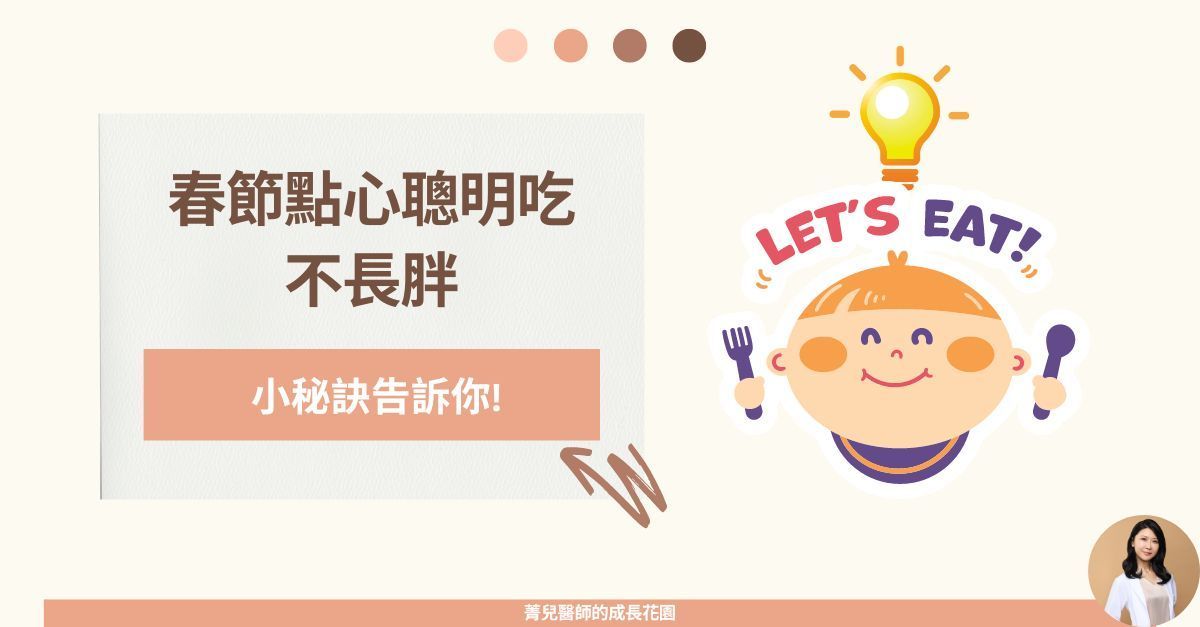 面對春節各種美食誘惑,有什麼小秘訣可以不長胖呢?點心要適量,盡量選擇蛋白質含量高的零食與朋友分享點心,不要太貪吃自己一個人吃完選擇穿插一些健康點心,如: 牛奶,豆漿,無糖優格加果乾,毛豆,水煮蛋,堅果…等,或是不甜的水果(芭樂,小番茄...等)盡量不要空腹吃精緻澱粉吃甜點等精緻澱粉前,先吃一點蛋白質或低糖水果墊墊胃,避免血糖快速上升 抑制生長激素分泌。吃點心時,選擇搭配牛奶或無糖豆漿,也可加入紅茶自製成拿鐵,補充蛋白質同時有飽足感,點心就不會吃這麼多了。家裡可常備一瓶無糖豆漿隨時可用。選擇傷害較少的時間吃點心選擇午餐飯後馬上吃一點點。午餐如果有吃飽,點心的量就不會吃這麼多了。白天活動量大,吃進去的熱量也比較容易被消耗掉。一定不要吃消夜! 每天晚上10點~凌晨2點是生長激素分泌最顛峰的時段,如果吃宵夜讓血糖上升,原本要分泌的生長激素就被抑制下來,浪費原本可以長高的機會。菁兒醫師小叮嚀春節聰明吃,希望這些小秘訣能幫助大家(盡量)不長胖。~菁兒醫師陪你身高超前部署~延伸閱讀...【兒童成長】長高最重要的食補『蛋白質』