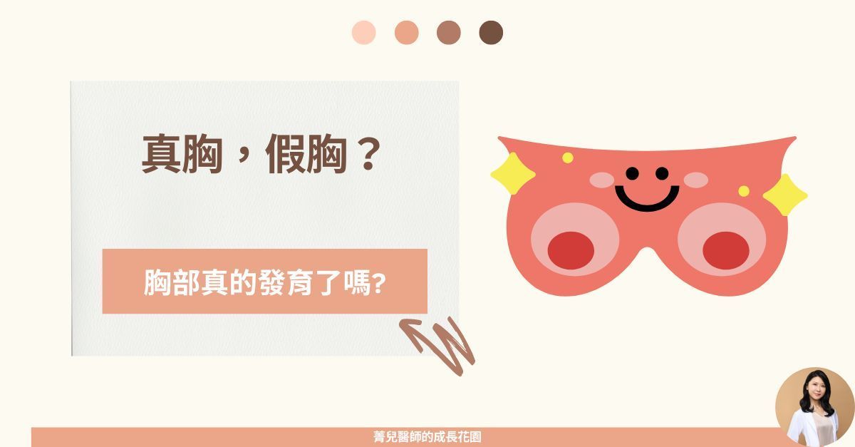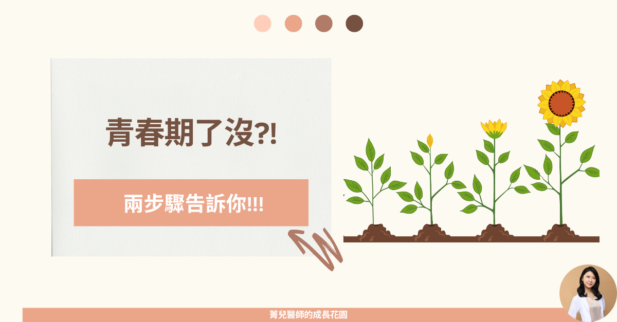 青春期好難發現喔!家長如何檢查小朋友是否進青春期呢??? 近年小朋友青春期提早的狀況越來越多,很多爸爸媽媽都很擔心自己的小朋友是不是進青春期了?有沒有那些方式可以在家裡初步判斷呢?今天菁兒醫師就跟提供大家兩步驟簡單方式判斷是否進青春期喔。 進入青春期的時間和發育順序 1.女生的正常青春期發育時間: 正常女生青春期從8-13歲期間,出現第二性徵都在正常範圍內。 發展順序大多從胸部微微突起開始,依序出現陰毛及腋毛,最後月經來潮。少部分女生會先從陰毛出現,再開始出現胸部隆起。 2.男生的正常青春期發育時間: 正常男生青春期從9-14歲期間,出現第二性徵都在正常範圍內。 發展順序從睪丸變大(>4ml)開始,接著出現陰莖變長依序出現陰毛及腋毛,最後才是變聲。 ✅小叮嚀: 在7-9歲就要開始注意小朋友的發育情況。 兩步驟判斷是否進入青春期 第一步:第二性徵是否出現 女生胸部發育 我們的胸部分成最下面的胸大肌,上面的脂肪,還有乳頭下面的乳房組織。真的胸部發育是指乳腺開始發育,所以在乳頭下方可以摸到一顆小小硬硬的乳房組織,用手可以捏起。 剛開始發育的胸部可能一邊有一邊沒有,也有可能忽然消失過一段時間又再出現,小朋友通常會反映有痛痛癢癢的,但也可能沒有特殊感覺。 男生的睪丸變大 我們在評估睪丸大小的時候,不包含外面的皮膚組織,因此要稍微用手捏一下顯現出睪丸真正的形狀。評估大小的時候,在家裡媽媽可以用自己大拇指的第一個指節當作簡單判斷標準,大小超出很可能進青春期了。 第二步:長高速度是否忽然變快 如果第二性徵比較難判斷,長高的速度也可以提供我們一個線索喔! 小朋友在不同年紀平均身長的速度不同。還沒進青春期之前通常長高速度是每年5-6公分,進入青春期後速度會變快,一年可長6-14公分。所以如果發現最近長高的速度忽然變快,半年超過3公分(一年超過6公分)要小心可能進入青春期了! 菁兒醫師小叮嚀7-9歲時就要開始注意小朋友的發育情況;如果「第二性徵出現」+「長高速度變快」,可能進入青春期了!~菁兒醫師陪你身高超前部署~延伸閱讀..【兒童青春期】停經針可以幫忙長高嗎?