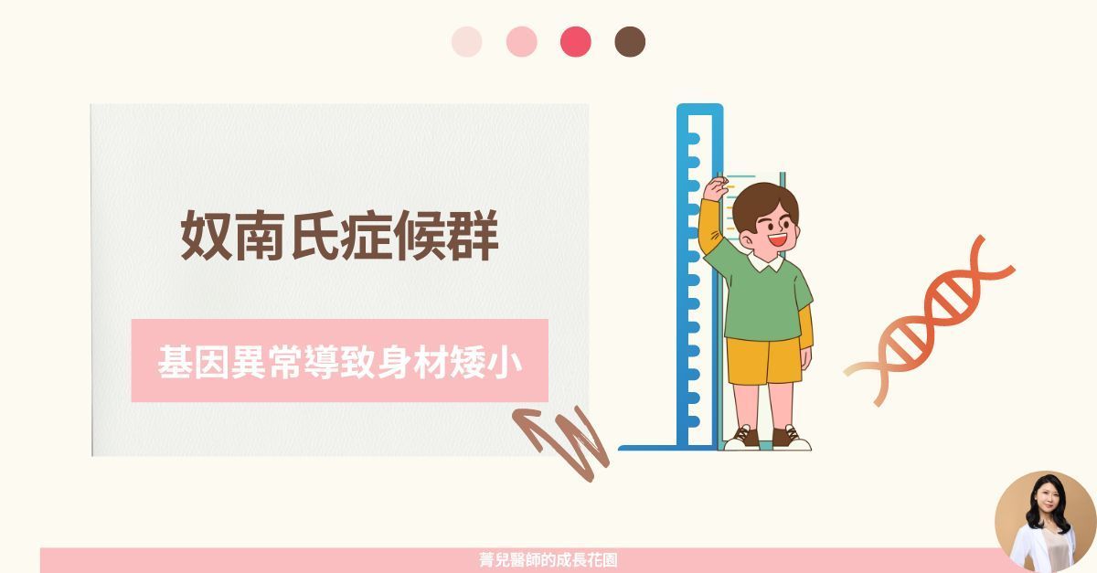努南氏症,相信兒童遺傳內分泌科的醫師都不陌生是其中一個可以透過『健保給付』生長激素的疾病努南氏症簡介努南氏症是一種遺傳疾病,臨床症狀有身材矮小、先天性心臟病、罕見的臉型(眼距過寬、眼內貲贅皮、下巴短小、低位耳)、蹼狀頸、漏斗胸、凝血異常及不同程度的發育遲緩等症狀。 目前跟努南氏症相關的基因有很多,其中約一半的患者為PTPN11基因缺陷造成,其他尚有RAF1、SOS1及KRAS...等與Ras-MAPK訊息傳遞路徑相關的基因。 努南氏症的遺傳模式是體染色體顯性遺傳,意思是爸爸媽媽其中一位患病(帶有致病基因),下一代不分男女,有50%的機率得到努南氏症。  努南氏症約有30~75%的病患有家族史。如果已知家族有家族史,可以在產前透過基因檢測確診,也可在懷孕期間經由超音波掃描是否有心臟結構的問題。 努南氏症造成的身材矮小而我們兒童遺傳內分泌科的醫師在臨床上看到如有身材矮小以及特殊臉型,合併先天性心臟病等情況,就會考慮進行基因檢測,確認是否是因為努南氏症所造成的身材矮小。若有確診基因報告,滿6歲可向健保申請生長激素治療。目前共有4種遺傳疾病可以申請健保給付生長激素治療:除了努南氏症之外,還有「透納氏症」,「普瑞德威利症候群」(俗稱「小胖威利」)和「矮小基因缺乏症」。 菁兒醫師小叮嚀造成身材矮小的原因有很多,遺傳疾病造成的身材矮小雖然較少數,但還是一個需要排除的病因。醫師看診時若覺得臨床症狀符合,便會考慮進行相關檢測。~菁兒醫師陪你身高超前部署~
