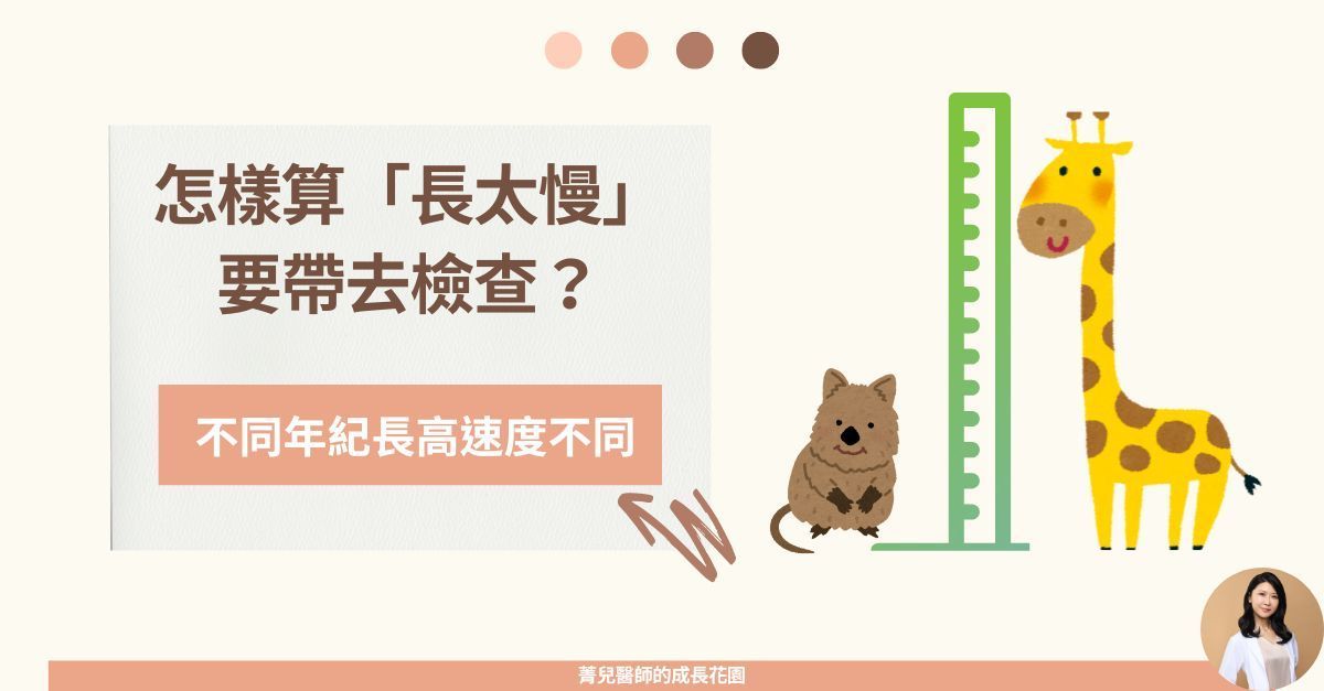 作者:陳菁兒「我一拿到身高體重通知單,覺得不對就趕快來了!他上下學期…只長高了一公分!」大家拿到身高體重通知單,有注意過上下學期差了幾公分嗎?一年至少要長幾公分才是正常的呢?正常長高的速度兒童在不同發育時期長高的速度不同。其中長的最快的有兩個時期,分別是:1歲之前,以及青春期。一般來說,孩子長高的歷程如下:寶寶出生的第一年長最快,平均一年可以長20-25公分。4歲之後,長高的速度會逐漸慢下來。4歲至青春期前的孩子,平均一年約長5到6公分。最低要求,一年至少要長4公分才算正常。直到青春期,孩子長高的速度又會開始加快,平均一年可以長6-14公分。所以孩子長高的速度不是每年都相同,會先由快變慢,再由慢變快。「長太慢」和「長太快」都要注意如果小朋友一年沒有長高4公分,要注意是否有病理性的原因導致生長緩慢,包括:遺傳或染色體疾病、內分泌問題或營養不足...等。其中如透那氏症、生長激素缺乏症、甲狀腺低下,如果在孩子發育完成前給予適當治療,可以明顯改善身高不足的狀況。另外小朋友如果太早長太快,在7-9歲長高速度忽然變的比之前快很多,一年大於6-8公分,也要留意小朋友有沒有第二性徵,可能(提早)進入青春期了。📍一年身高「長不到4公分」,要至兒童內分泌或遺傳專科排除病理性原因。📍太早長太快,要注意是不是提早進入青春期。兒童成長每年都很重要拉長時間來看,小朋友每個階段的生長速度都很重要。身高是時間累積的效應,長高速度正常不代表以後就會很高!試想如果在4-9歲這5年,每年長高6公分的人和每年長高5公分的人相比,每一年雖然成長差距只有一公分,但累積5年後身高差距就是5公分。如果可以從小確實把握長高時間,一刻都不浪費的先長好長滿,那麼時間一長期望的身高自然指日可待。另外也要把握可以長高的速度:我們都說進入青春期會開始衝刺身高,之後長高就會趨緩然後結束。所以要如何即時發現青春期、把握最後機會也是一個重要的課題。規則紀錄身高了解成長狀況規則紀錄身高,可以幫助我們了解小朋友目前成長的狀況。如果發現長高速度與預期不同,可以提早檢視是否需要處理記錄身高的有幾點需要注意定時紀錄,至少每半年一次除了身高之外,體重和BMI值也應該一併紀錄最理想的狀況是將每次身高體重的百分位,製作成生長曲線表📍每半年紀錄身高體重,了解目前成長的狀況📍身高百分位<3%,要至兒童內分泌或遺傳專科排除病理性原因。菁兒醫師小叮嚀兒童成長每年都很重要。每半年紀錄身高體重,了解目前成長的狀況。有以下狀況請至兒童新陳代謝或兒童內分泌專科追蹤成長期一年<4cm身高百分位<3%~菁兒醫師陪你身高超前部署~延伸閱讀...