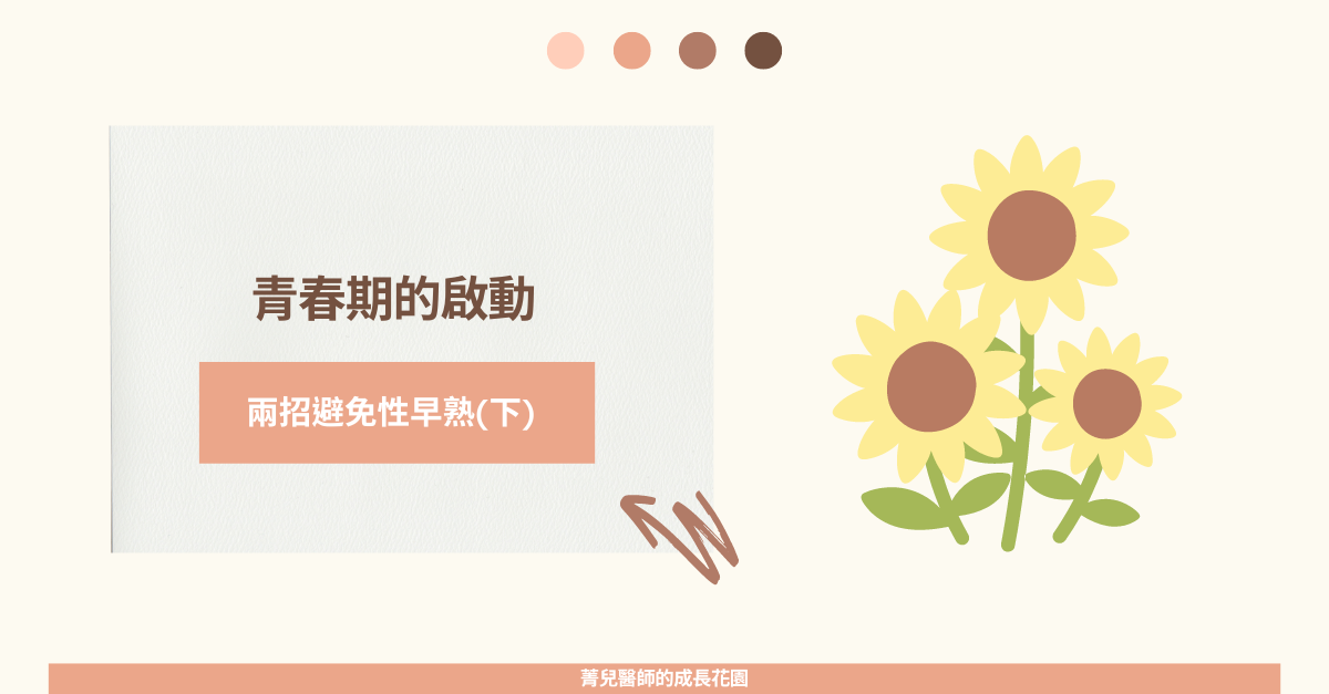 「日常生活中,注意那些事可避免性早熟呢?」「如何避免性早熟?」這個問題,是幾乎每個位爸爸媽媽來門診都會問的問題。想要避免性早熟,我們要先知道荷爾蒙的來源有哪些?性荷爾蒙的來源,可以簡單分成從「身體自己分泌」以及「外來環境得到」兩種。「身體自己分泌」的荷爾蒙來源,除了我們熟知的生殖器官之外,我們身體的腎上腺還有脂肪細胞等也會分泌性荷爾蒙喔!而「外來環境得到」的部分,最常見的就是大家熟知的環境荷爾蒙!青春期的啟動-性腺軸線進入青春期的訊號其實是由腦部發出的。我們可以把整個身體想像成一個公司,腦部作為我們各種生理機制的調節中樞,就是公司總部,負責下達各種指令。依照權限高低,又細分成大老闆(下視丘)分泌「促性腺釋素」,告訴廠長(腦下垂體)要開始進入青春期了,廠長(腦下垂體)又會再分泌「濾泡刺激素」及「黃體激素」,告訴員工(生殖器官,包含卵巢及睪丸)開始分泌性荷爾蒙。因此我們可發現,最初始進入青春期的訊號是由公司中樞,也就是腦部發出的。進入青春期的訊號一層一層的往下傳遞,造成了我們青春期的啟動。這整個訊號傳遞的過程,也稱為「性腺軸線」。在這個過程,只要有任何一個步驟出現問題,像是腦部有腫瘤或是生殖器官結構有問題,都有可能造成青春期提早啟動,也就是性早熟。如果是公司總部,也就是腦部太早發出進入青春期訊號所引發的性早熟,我們稱之為「中樞性早熟」。而不是由公司總部,而是由下游工廠製造出性荷爾蒙造成的性早熟,我們稱之為「周邊性早熟」。不過大家先不要太擔心,多數女孩們的中樞性早熟,是找不到任何病理原因的,我們稱之為「特發性中樞性早熟」。我們可以想像成是大老闆和廠長任性下達進入青春期的指令,任性是不需要理由的。女孩如果6歲前有發育現象,或是男孩有性早熟的現象,是病理性的機率較高,需要特別注意。性荷爾蒙抑制劑大家常聽到俗稱「停經針」,藥名為達菲林或柳普林。其藥理作用原理,就是從公司總部,抑制我們腦部中樞發出「進入青春期」的訊號,治療「中樞性早熟」。延伸閱讀...【兒童青春期】青春期的啟動,兩招避免性早熟(下)