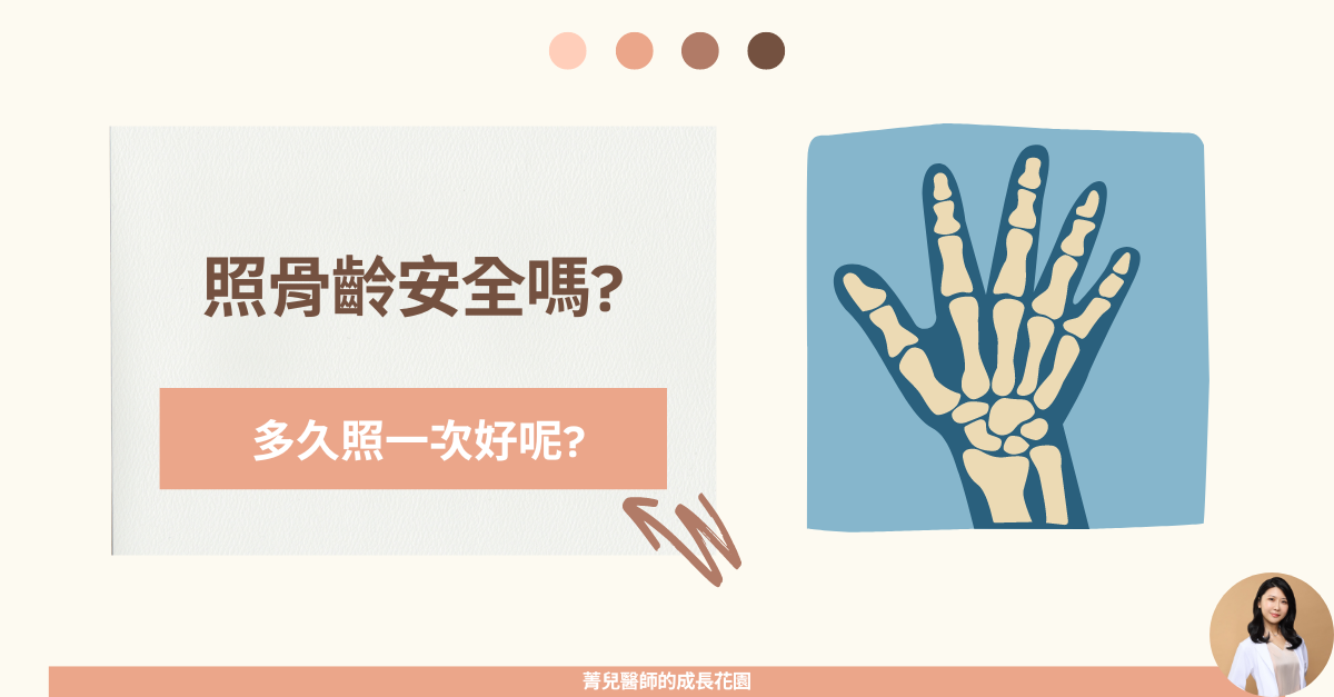 作者:陳菁兒許多第一次照骨齡的爸爸媽媽,常常會有點擔心的問:哇照骨齡安全嗎!會不會有輻射線暴露的風險呢?骨齡是什麼呢?骨齡就是骨頭的年齡,我們可以利用骨頭的成熟度評估孩子的成長形況。骨齡像是一個成長地圖,告訴我們孩子在生長旅程中的具體位置。比如說,一個實際年齡10歲的孩子,可能骨齡顯示他像8歲或12歲的孩子一樣成長。這就像是有些孩子在成長道路上走得快,有些走得慢,每個人的步伐都不一樣。拍攝骨齡的輻射劑量骨齡是照左手的X光,拍攝手腕這樣的小範圍部位的X光片檢查,輻射劑量極低。具體的輻射劑量因設備和檢查方式的不同而有所差異,但一般來說,手腕X光片的輻射劑量大約在0.001毫西弗(mSv)到0.01毫西弗之間。骨齡與日常生活中的輻射比較輻射除了一般生活上的各類應用之外,在我們的生活環境中,也存在著天然背景輻射,包括來自宇宙射線、地球岩石、建築材料和人體體內因自然存在或呼吸飲食攝入人體的放射性核種輻射。依照台灣核能安全委員會的資料,台灣地區每人每年接受的天然背景輻射劑量約為1.6毫西弗,相當於數百次手腕X光片的輻射劑量。為了讓這個數字更具體,我們可以把手腕X光片的輻射劑量與日常生活中的輻射來源以及常見檢查的輻射劑量進行比較。例如:一次左手骨齡X光攝影劑量:0.01毫西弗。一次牙科全口X光攝影劑量:0.01毫西弗。一次胸部X光攝影劑量:0.02毫西弗。一次頭部斷層掃描攝影劑量:2毫西弗台北搭飛機往返美國西岸一趟劑量:0.09-0.14毫西弗。總結來說,照一次骨齡的輻射劑量相當於一次牙科全口X光或是搭往美國的飛機上2小時。手腕X光片的輻射劑量極低,並且遠低於我們日常生活中經常接觸到的輻射量。而且照骨齡時,X光暴露時間只有幾秒鐘,左手掌也沒有重要器官,基本上相當安全。多久照一次骨齡呢骨齡檢查的頻率依照每位孩子的成長情況而有所不同。一般來說,如果孩子的生長發育正常,沒有明顯的生長問題,且未進入青春期,一般不需要頻繁地進行骨齡檢查。通常,每年一次的檢查就足夠了。如果孩子有生長或發育異常的情況,例如生長遲緩、性早熟或其他內分泌問題,可能會建議每3到6個月進行一次骨齡檢查,以便及時發現問題並採取適當的治療措施。或是正在進行相關治療中的孩子,也可能會較密切追蹤骨齡以評估治療效果。骨齡只是生長評估的一個項目對於兒童成長的評估,骨齡是一個非侵入性,且輻射劑量極低相當安全的檢查。規則的依照醫師建議回診追蹤是很重要的。因為骨齡只是生長評估的其中一個項目,其他像是成長的速度,青春期發育,生活作息及營養攝取等都是評估要點,建議還是要至兒童新陳代謝及內分泌專科醫師門診追蹤,才能更全面的評估孩子成長,把握成長黃金期。菁兒醫師小叮嚀骨齡可以評估孩子的成長狀態,輻射劑量極低相對安全。骨齡檢查需搭配專科醫師門診追蹤,才能更全面的評估孩子成長,把握成長黃金期。~菁兒醫師陪你身高超前部署~